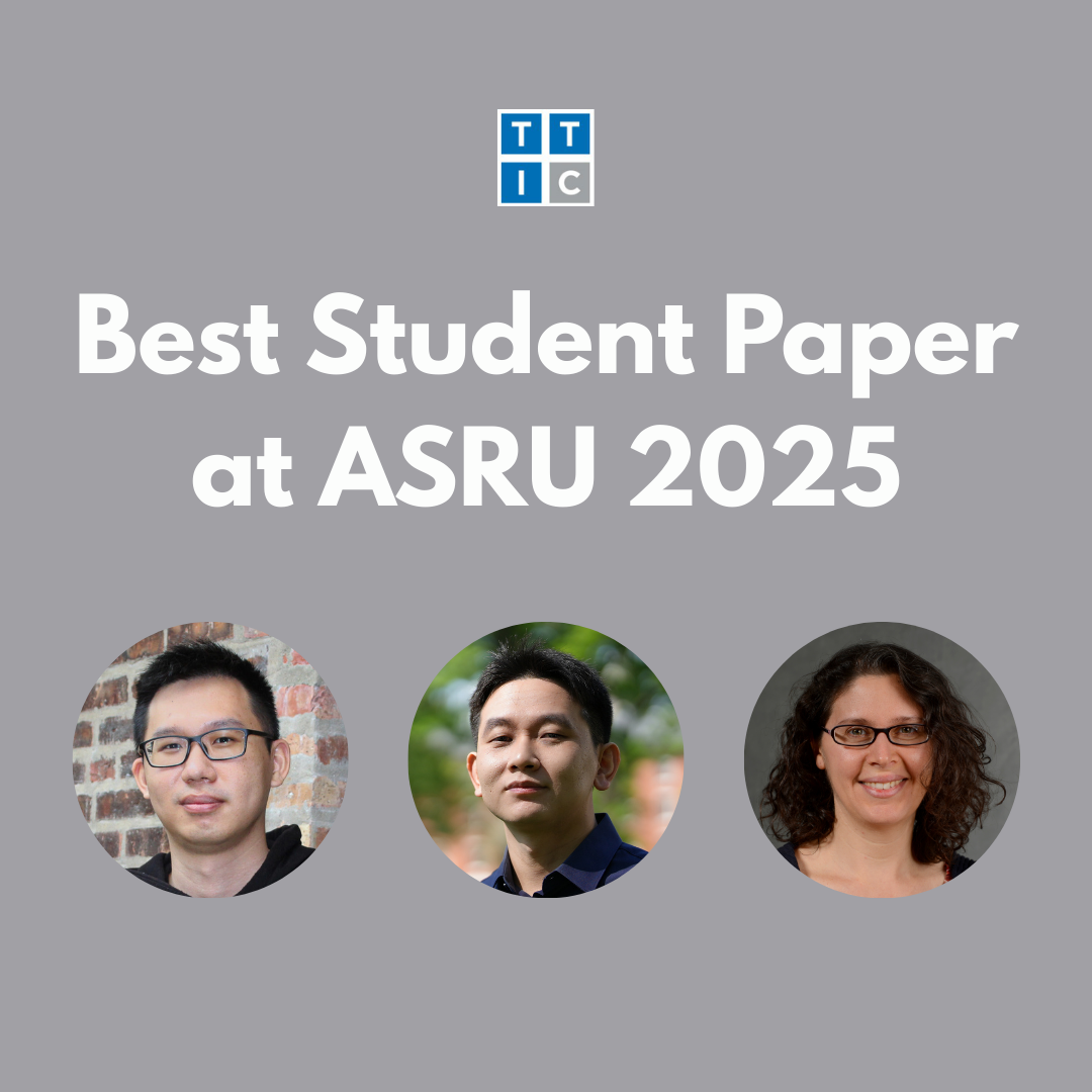 Ph.D. candidate Ju-Chieh Chou, TTIC research faculty alumnus Professor Jiawei Zhou (Stony Brook University), and Professor Karen Livescu received the Best Student Paper award at the 2025 IEEE Automatic Speech Recognition and Understanding Workshop (ASRU) for their paper, “Flow-SLM: Joint Learning of Linguistic and Acoustic Information for Spoken Language Modeling.”
